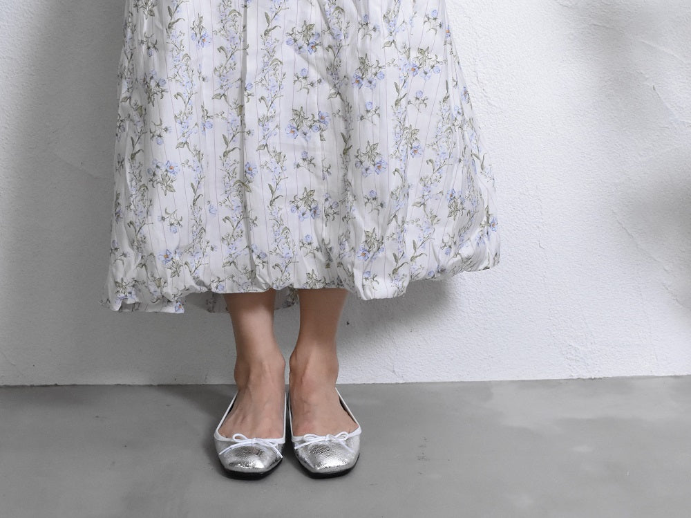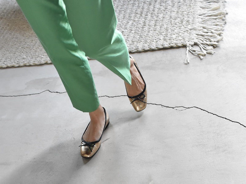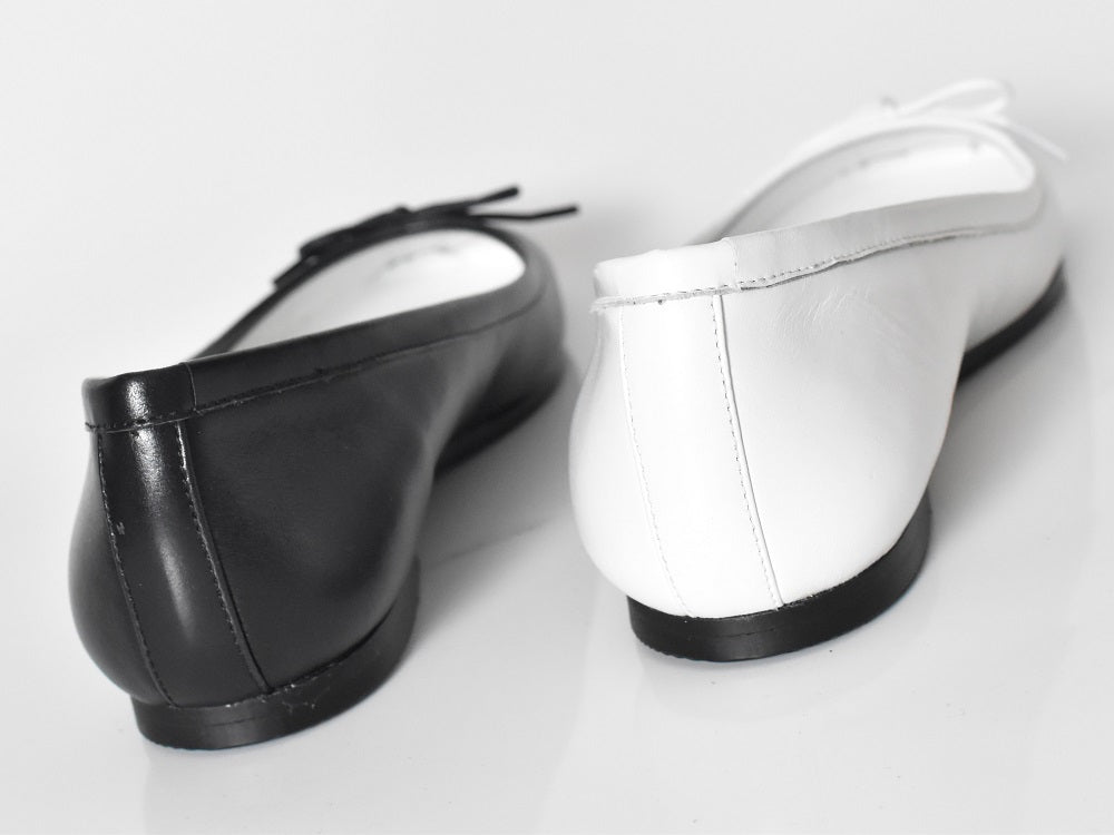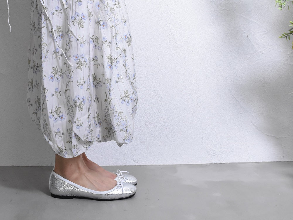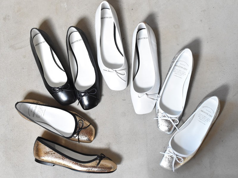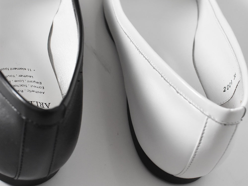 スクエアトウのミニマルなバレエシューズ。Blackは肌理の細かいKip(仔牛革)で高級感のある仕上がりに、Whiteは柔らかく足当たりの良い仕上がり。SilverpaisonとGoldpaisonはPig(豚革)の目を惹くキラキラな箔押しの加工革で印象的な仕上がりです。