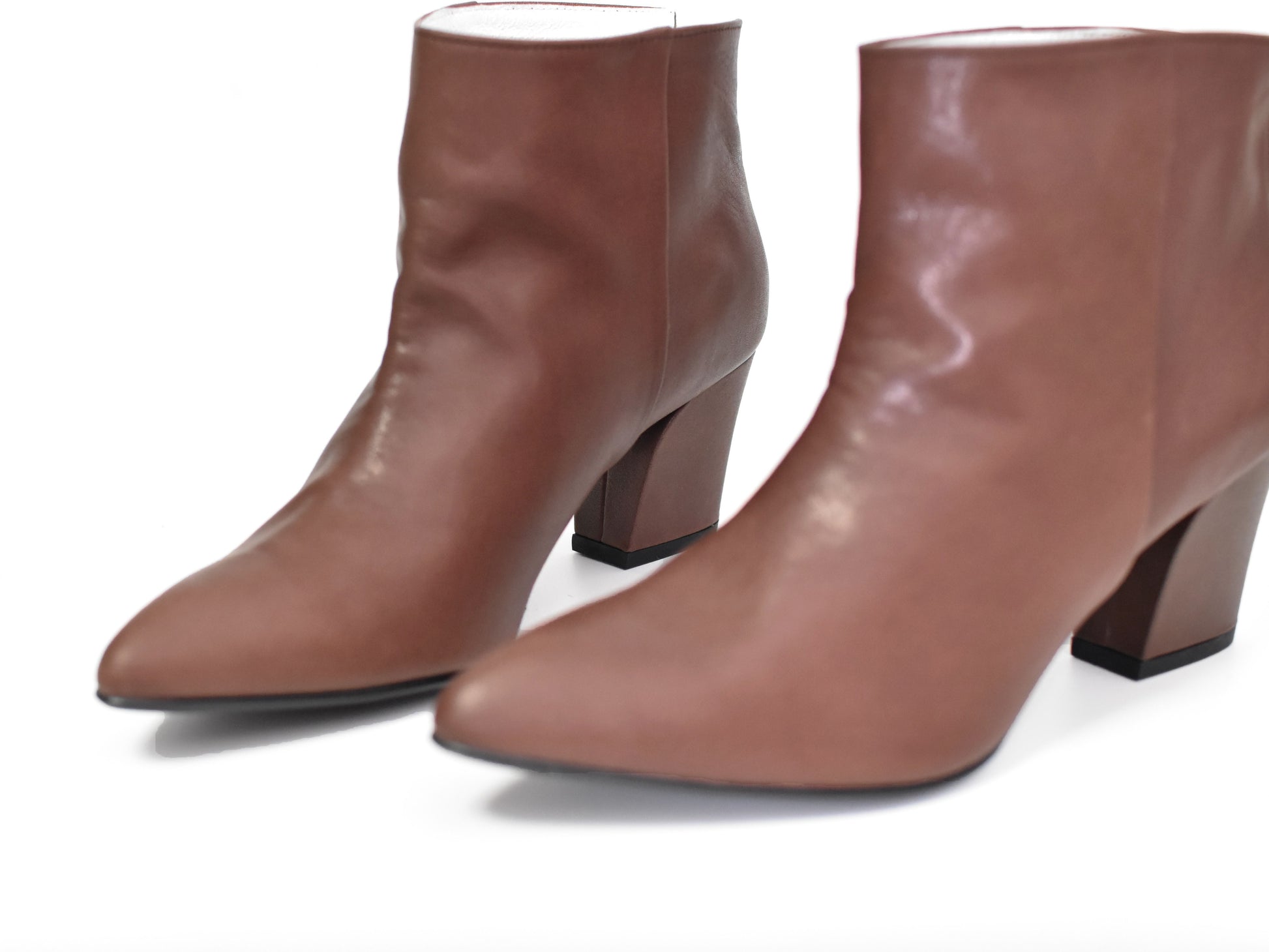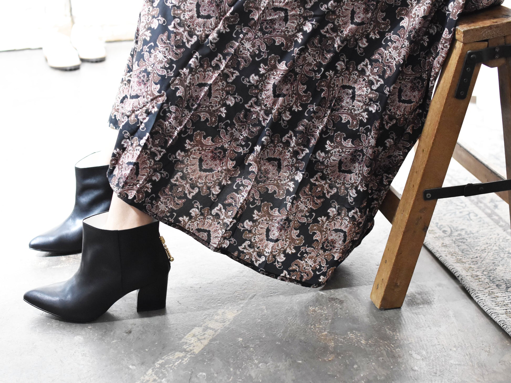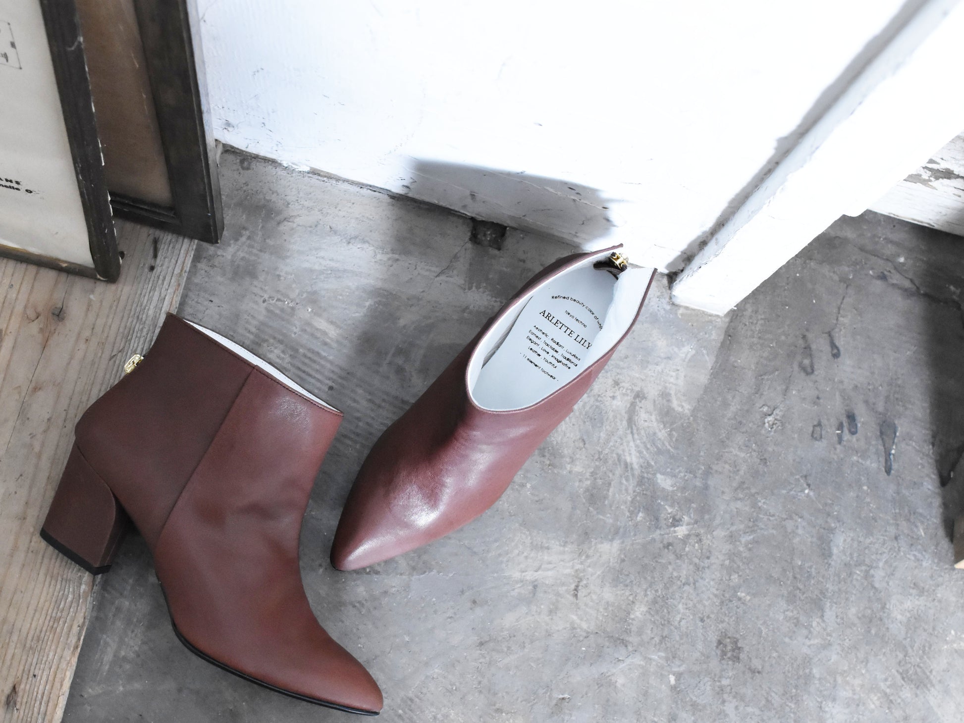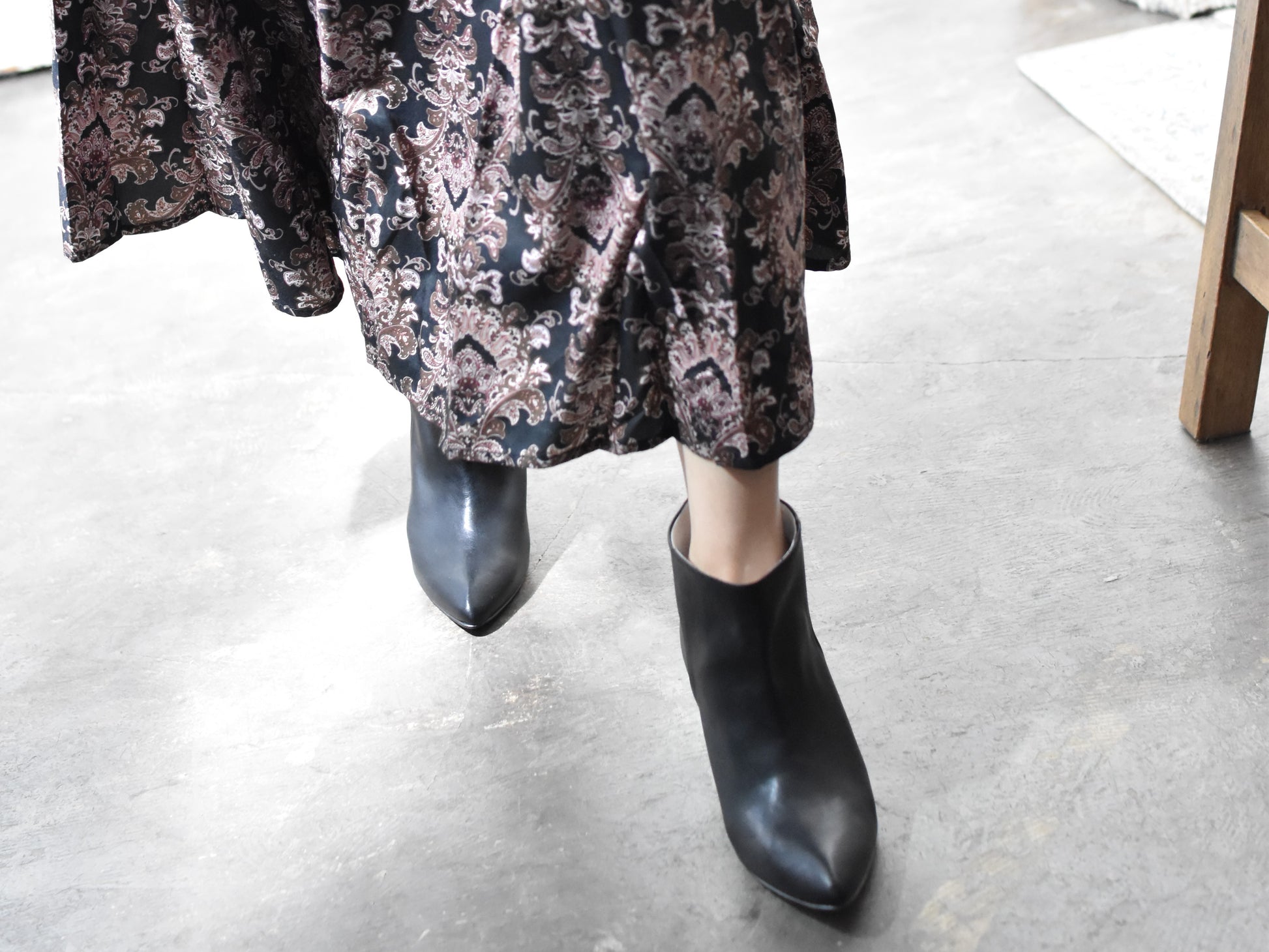 パンプスラインで人気のポインテッドの木型で、履き口が広い今っぽいショートブーツを作成しました。コーディネートを選ばず長いシーズン履き続けられるアイテムです。