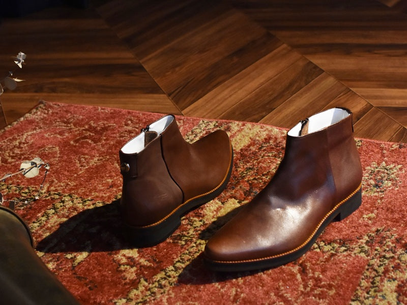 マニッシュなフォルムが印象的なショートブーツ。少し厚底のボリュームあるソールはスポンジ材を重ねて作られているので見た目よりも軽量で、履きやすく疲れにくい仕様。