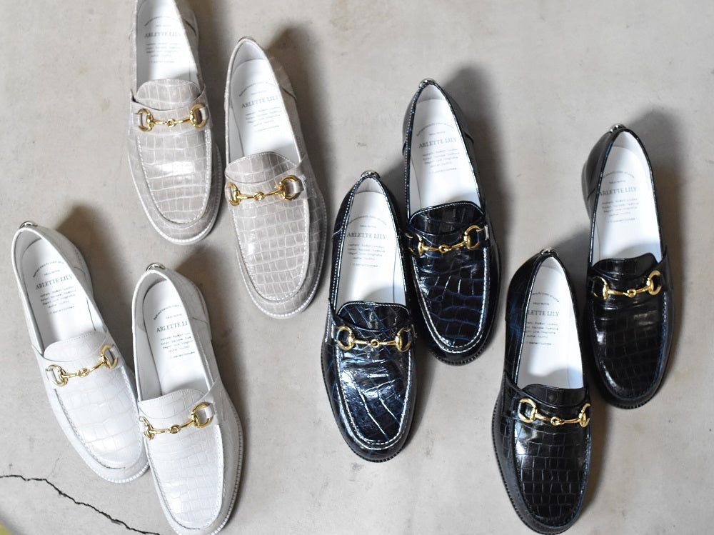 スムースレザー、クロコ型押しレザーともに丈夫でハリのあるKip(仔牛革)を使用しているので、非常に長く履けるARLETTE LILYの定番商品です。