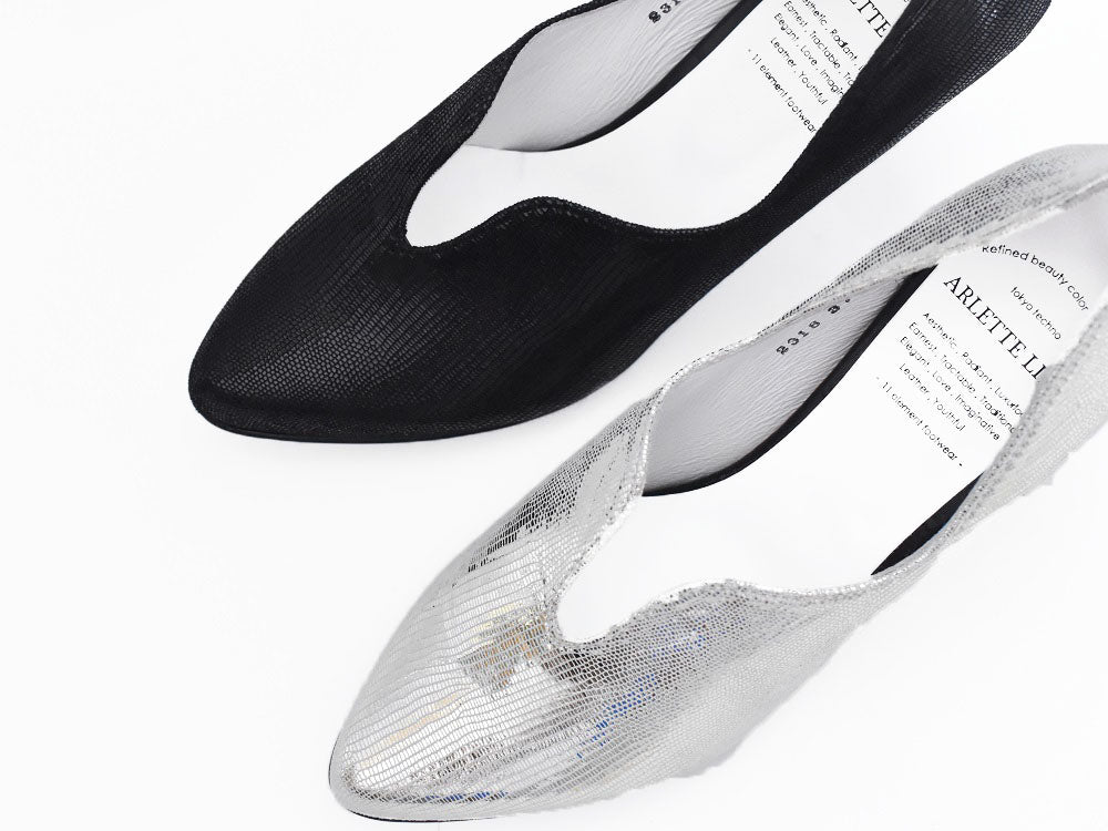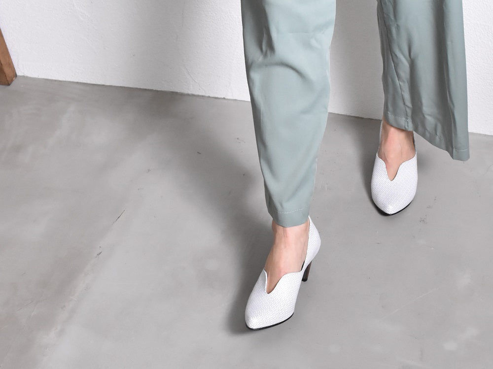 文字通りセミハートのカッティングが美しいパンプス。7cmの中寸ヒールはカーブを描いた曲線が美しいバナナヒールで横からのフォルムを一段と引き立ててくれます。