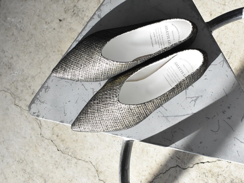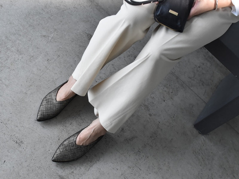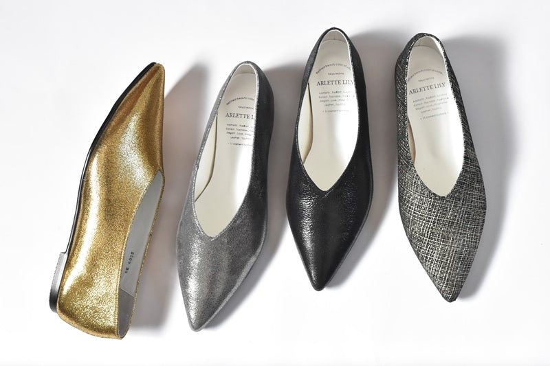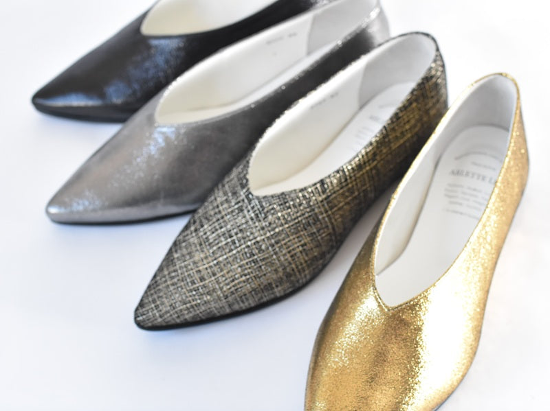 ヒール傾斜5mmの今っぽいぺたんこフラットシューズ。履き口が深く設計してあるので、包み込むような安定感を感じられます。素材は柔らかい山羊革を加工した革を使い足当たりの良い、目を惹くカラーリングでご提案しています。