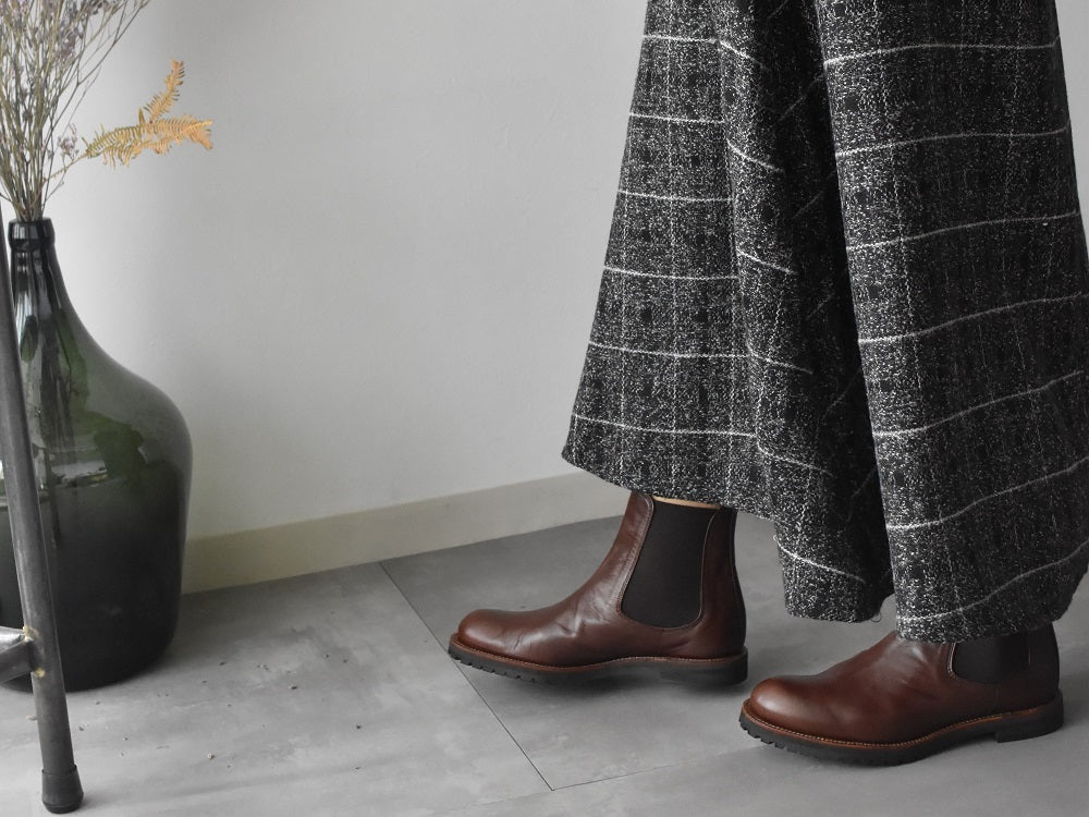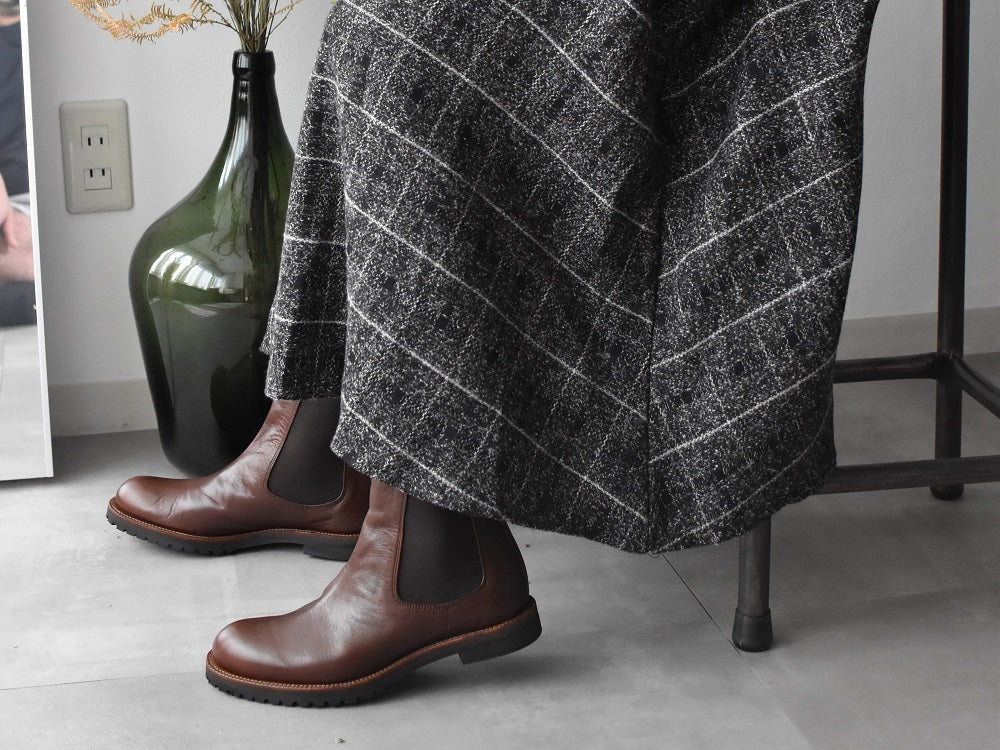 冬の定番と化したサイドゴアブーツ。飽きの来ない普遍的なデザインだからこそシンプルで個性は出さず永く履いてもらえることに重点を置き、レザーはオイルが効いて柔らかいステア(成牛革)を使い、ソールには軽くて丈夫な高圧スポンジ材EVAを積み重ね、底面は削れにくいタンクソールを使用しています。