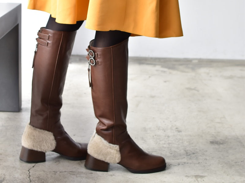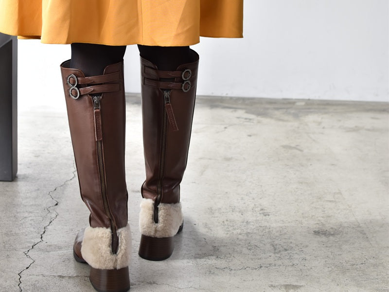 プラットフォームソールとボリューミーなヒール、踵のムートンレザーが目を惹くロングブーツ。筒上部のベルト金具が女性らしさをプラス。アルレットリリーを代表する定番ロングブーツ。