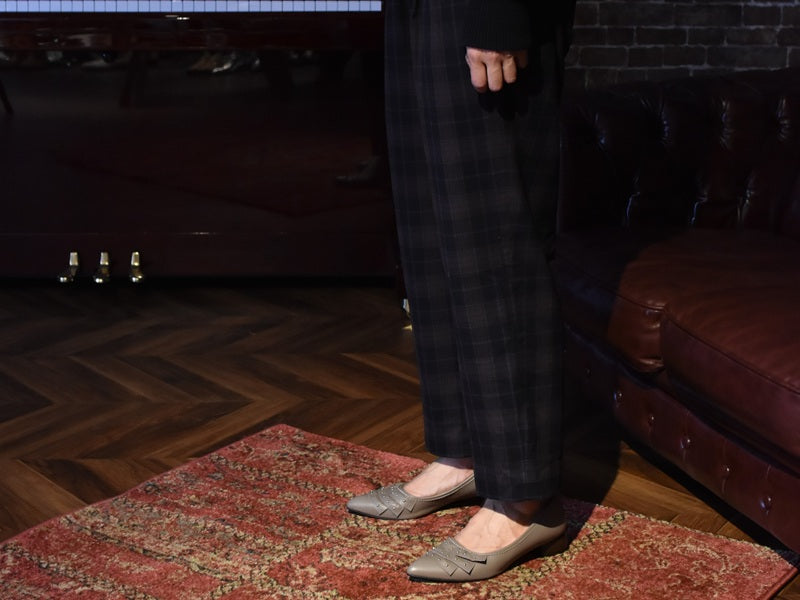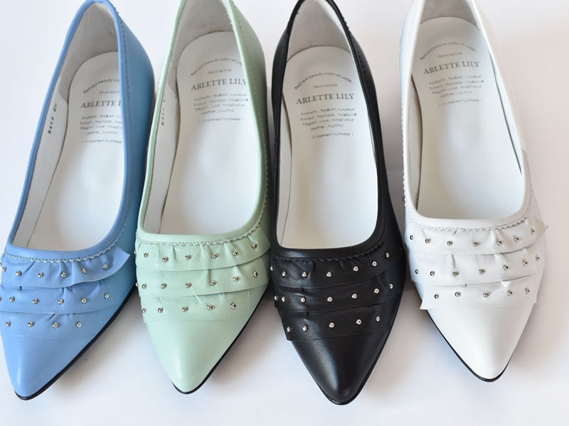 ネイルヘッドが散りばめられたフリンジが愛らしいポインテッドパンプス。トウ先がとがっているので一見シャープに見えますが、足がしっかりと納まる履きやすい靴。ヒール傾斜は3cmで女性が最も楽に感じられる設計。ヒールの形状も丸みを帯びた変形ヒールでインポートシューズのような特別感満載のパンプスです。